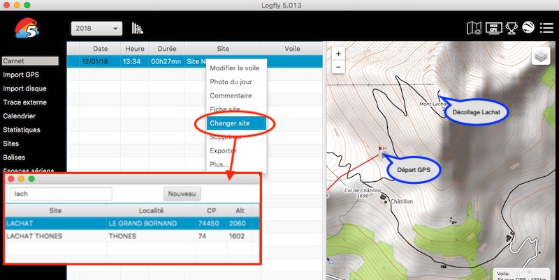 Vous avez décollé de votre site habituel mais vous avez oublié d'allumer le GPS. Logfly va créer un site au premier point de la trace. A l'aide de l'option Changer site, il suffira de choisir le site de décollage dans la liste présentée par un double clic. Vous pourrez ensuite supprimer le site créé inutilement dans la liste des sites.