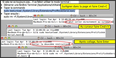 ben oui... c'est possible... ce serait même assez courant avec ce genre de driver. Rebooter le Mac et si cela ne marche toujours pas retenter une installation. Toujours rien? Il faut démonter cette mauvaise installation et là on n'est plus dans le clic feutré sur la pomme !!! Normalement vous devriez pouvoir mettre à la corbeille le fichier /System/Library/Extensions/PL2303.kext ou le fichier /System/Library/Extensions/ProlificUsbSerial.kext sans compte superuser. Ces chemins sont donnés en anglais. Pour trouver il faut aller sur l'icône du disque dur, puis -> Système -> Bibliothèque -> Extensions. Chercher ensuite l'un des deux fichiers cités ci dessus.