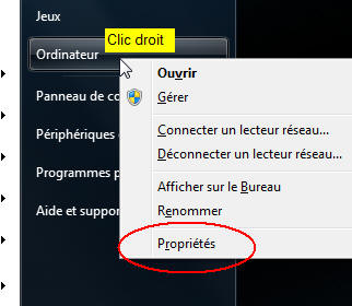 Cliquer sur démarrer en bas à gauche, ensuite clic droit sur Ordinateur, clic sur Propriétés.